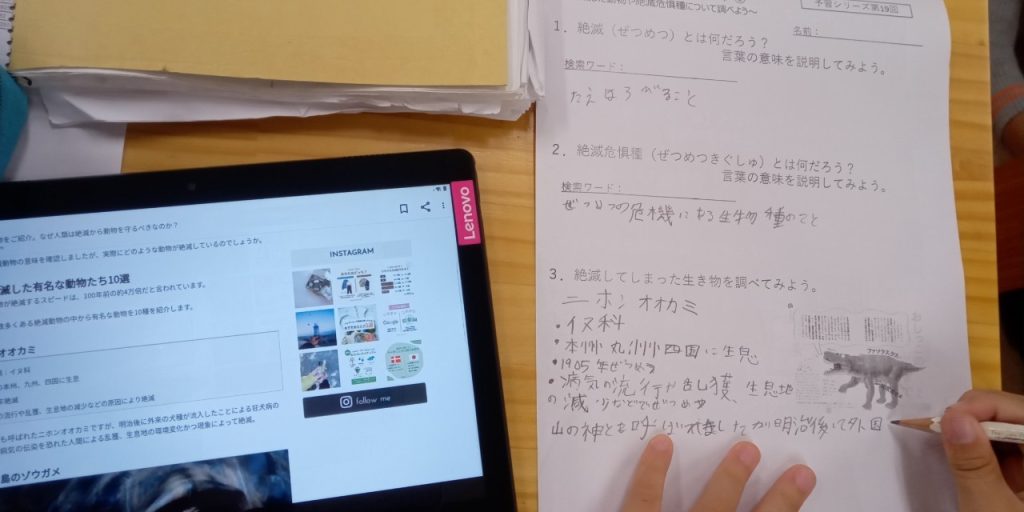 調べ学習を通して社会・理科の知識を身に着けつつ、自分の考えを発表することを目指します。