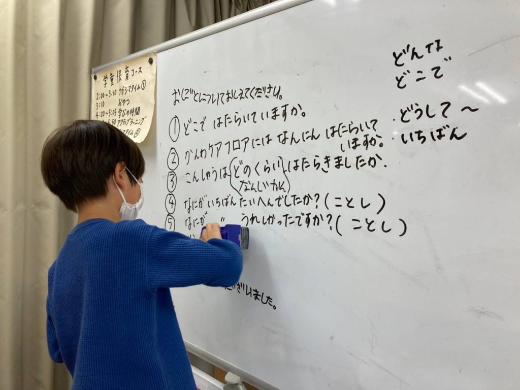 先生に楽しくお話するような気持ちで文章を構成していきます。大好きなものが相手に伝わったとき、自分の気持ちをわかってもらえたとき、子どもたちはとってもうれしい表情をしてくれます。温かい雰囲気で進めていきます。