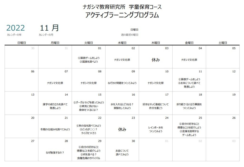ここでは、11月のアクティブラーニングの月間スケジュールをご紹介します。
