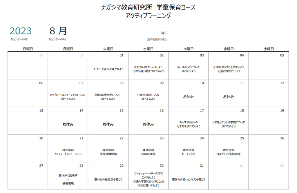 ここでは、8月のアクティブラーニングの月間スケジュールをご紹介します。