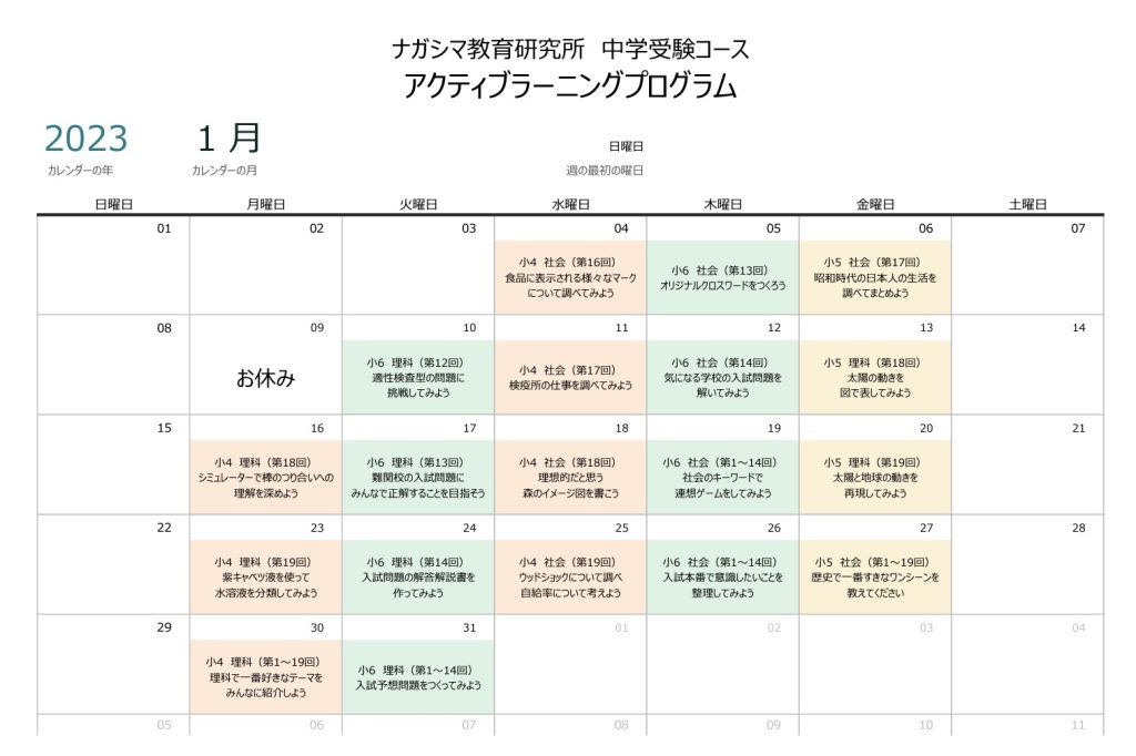 ここでは、1月のアクティブラーニングの月間スケジュールをご紹介します。