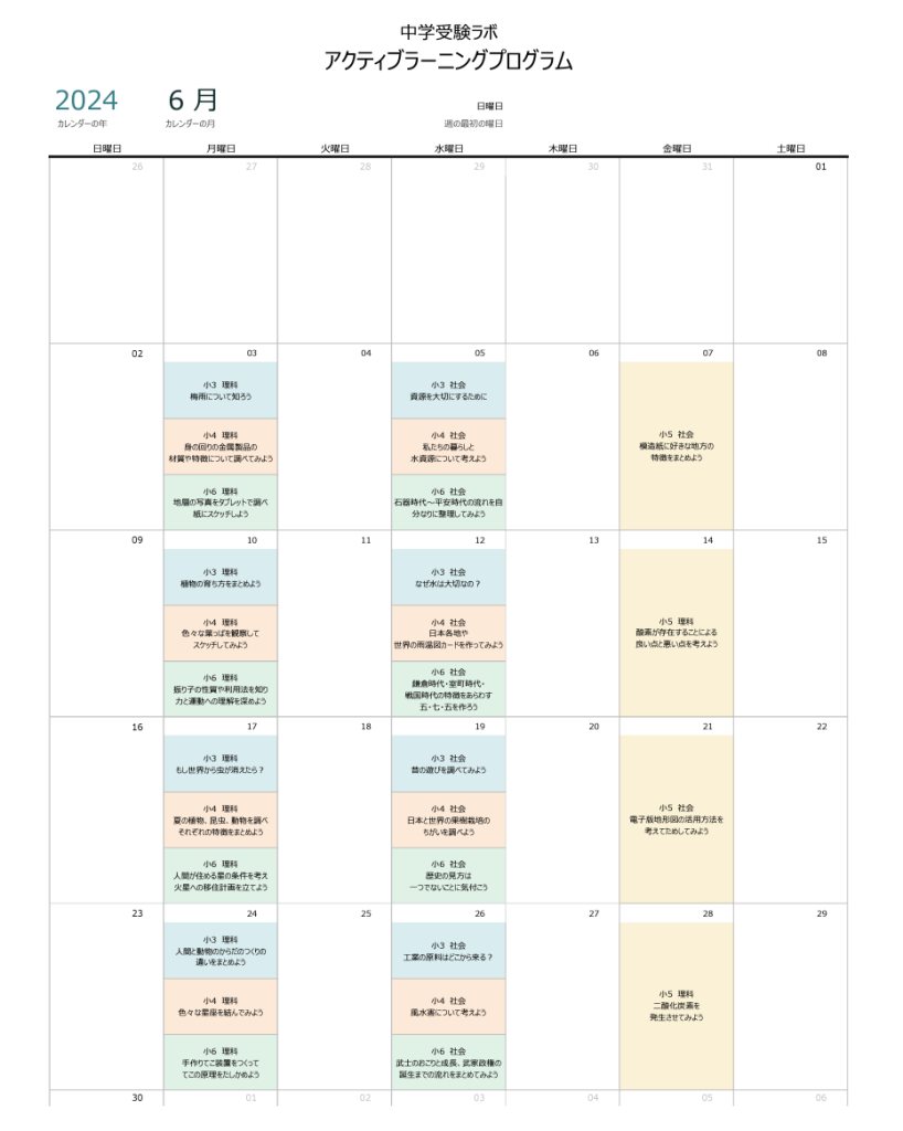 ここでは、6月のアクティブラーニングの月間スケジュールをご紹介します。