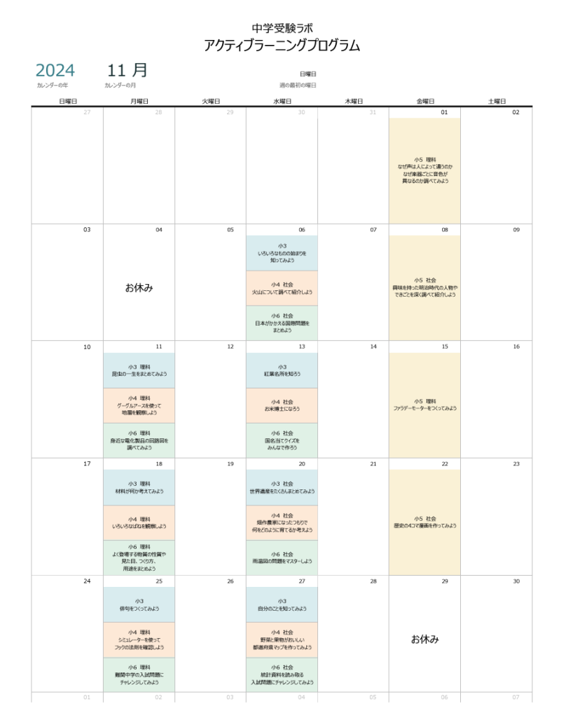 ここでは、11月のアクティブラーニングの月間スケジュールをご紹介します。