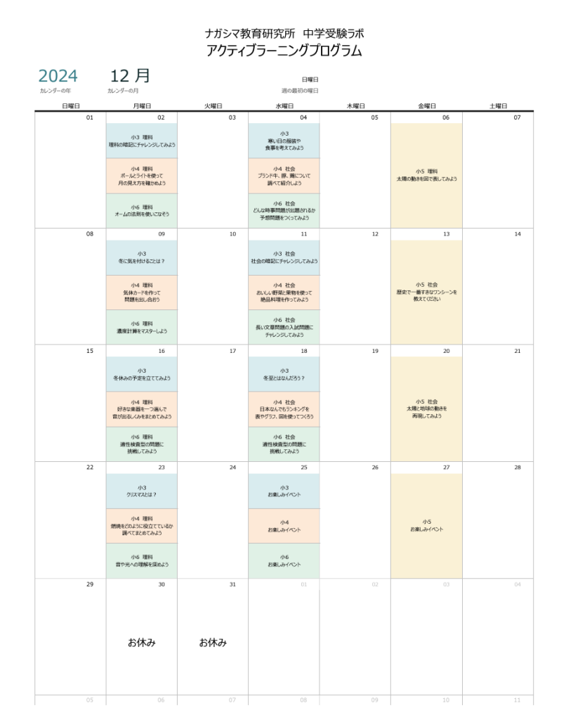 ここでは、12月のアクティブラーニングの月間スケジュールをご紹介します。
