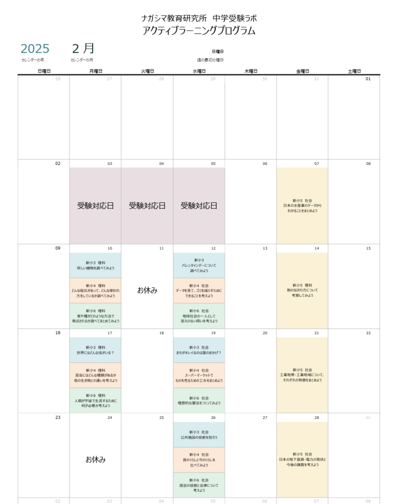 ここでは、2月のアクティブラーニングの月間スケジュールをご紹介します。