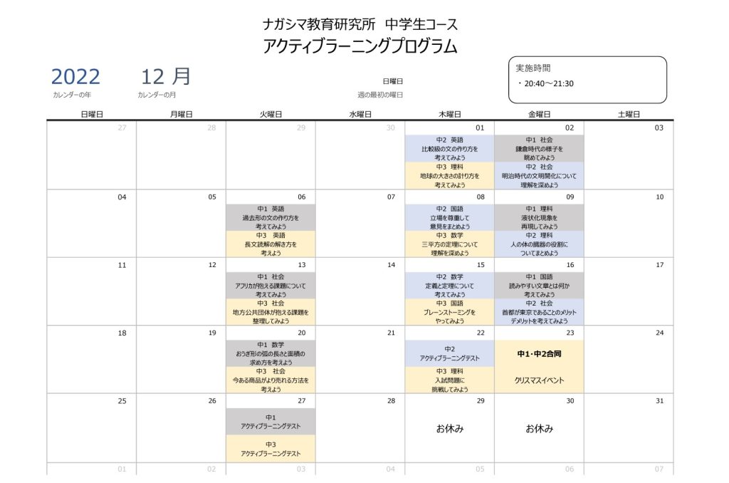 ここでは、12月のアクティブラーニングの月間スケジュールをご紹介します。