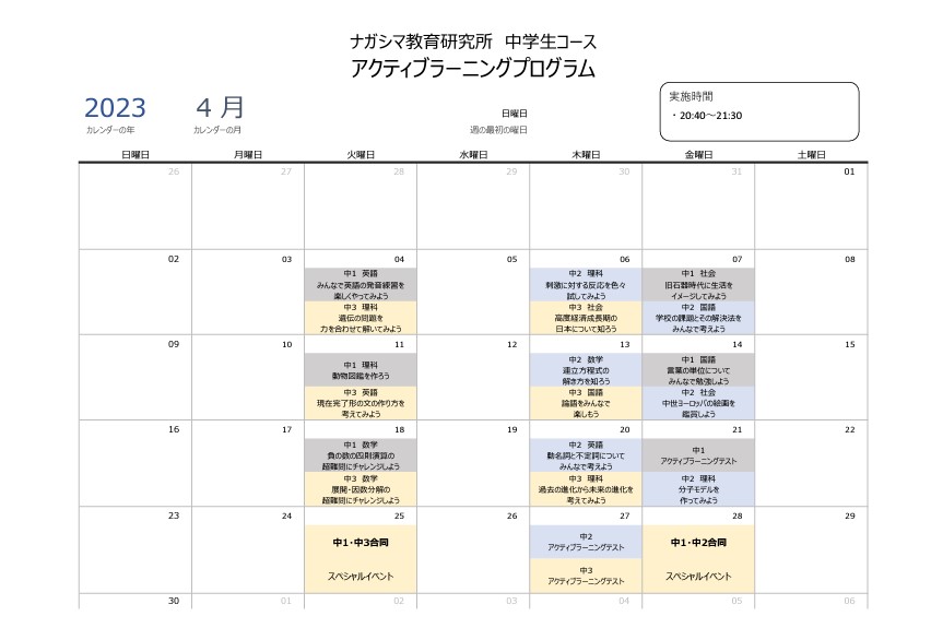 ここでは、4月のアクティブラーニングの月間スケジュールをご紹介します。