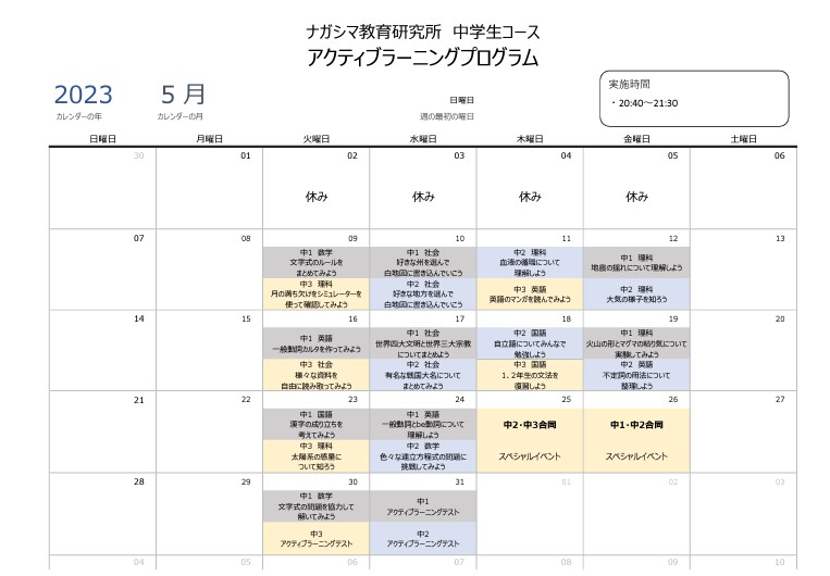 ここでは、5月のアクティブラーニングの月間スケジュールをご紹介します。
