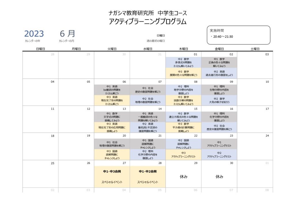 ここでは、6月のアクティブラーニングの月間スケジュールをご紹介します。