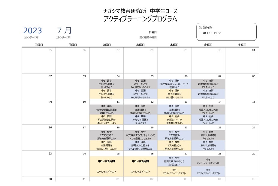 ここでは、7月のアクティブラーニングの月間スケジュールをご紹介します。