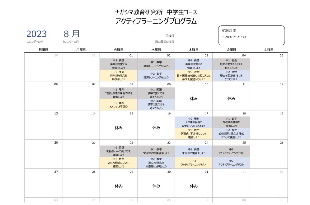 ここでは、8月のアクティブラーニングの月間スケジュールをご紹介します。