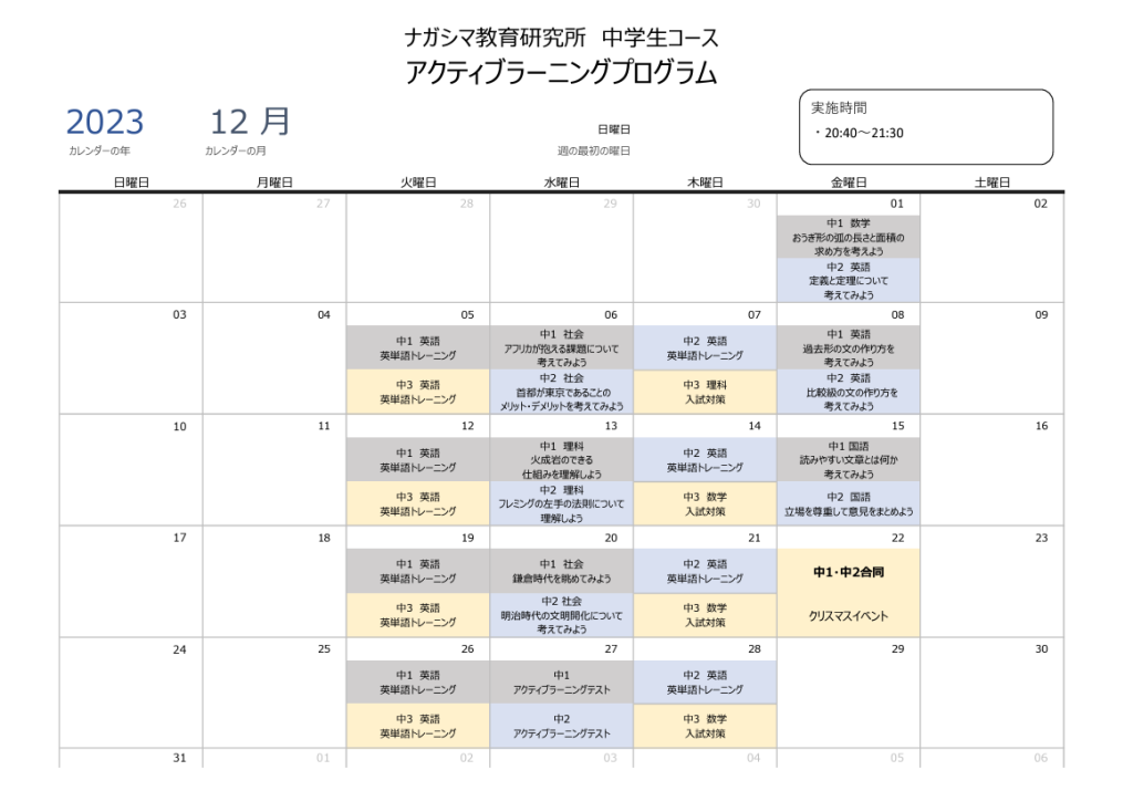 ここでは、12月のアクティブラーニングの月間スケジュールをご紹介します。