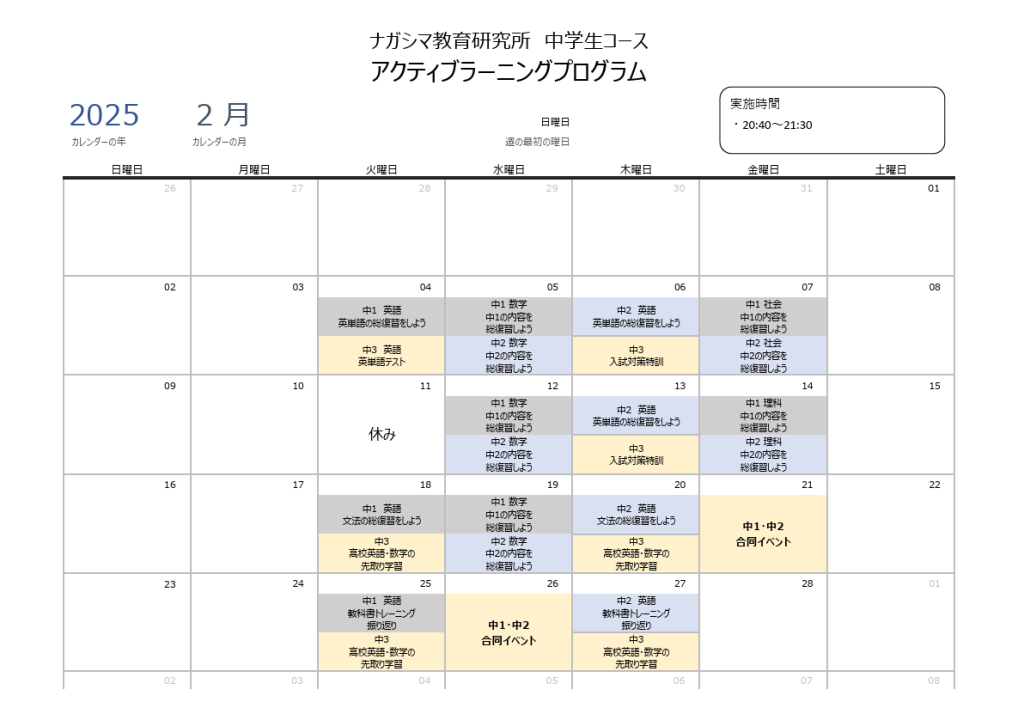 ここでは、2月のアクティブラーニングの月間スケジュールをご紹介します。